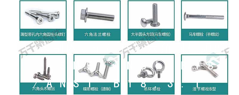 (二)、馬車螺絲/圓頭方頸螺栓(CarriageBolts):ANSI/ASMEB18.5;DIN603;ISO8677;GB12;GB14(三)、內(nèi)六角螺栓(Hexagonsocket-headcapscrews):DIN912;GB70;ISO4762;ANSI/ASMEB18.3(四)、六角木螺絲(HexagonHeadLagScrews):ANSI/ASMEB18.2.1DIN571(五)、家俱螺絲(Furniturescrews):依客戶標(biāo)準(zhǔn)(六)、六角法蘭螺栓( 常用螺絲種類 A: Machine Screw: 機(jī)械螺絲 B: Tapping Screw: 自攻螺絲 (分使用于金屬與使用于塑料二種)B-1: Sheet Metal Tapping Screw. (鐵板牙自攻螺絲)B-2: Plastic Tapping Screw. ( 塑料用, 自攻螺絲)C: Wooden Screw : 木工螺絲 D: Drywall Screw : 水泥墻螺絲 E: Self Drilling